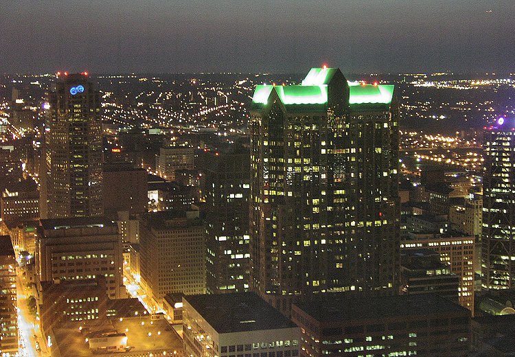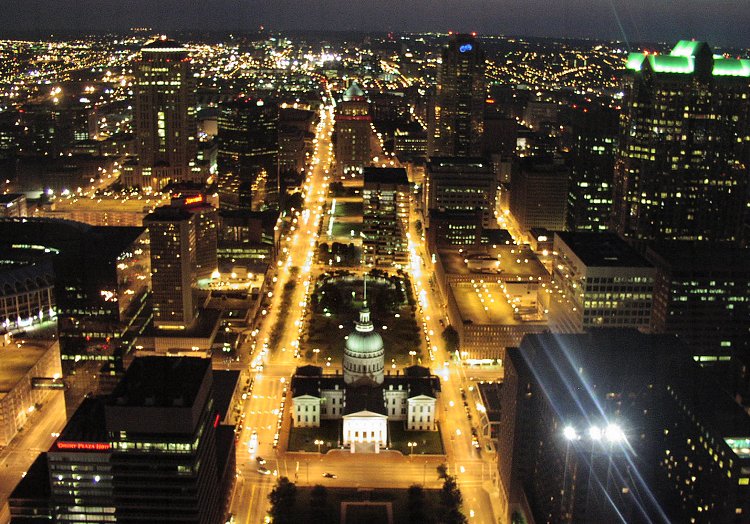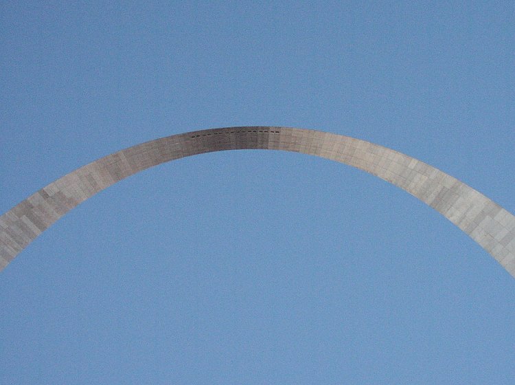 When I drove from West Virginia to San Diego, I drove a route that took me through St. Louis. As usual, I was on a tight driving schedule and and had not given any advance thought to sight-seeing. But as I approached St. Loius, Genelle told me by cell phone that I really should stop and see The Arch. It was 9:00 pm as I finally found a place to park the RV. I ran over to the arch in fading daylight and snapped off a few pictures just before running completely out of light. Then, to my surprise, The Arch was still open for rides to the top. From the ground, the windows up there look so tiny, yet they are actually quite large. Unfortunately, the windows are very thick and tend to be dirty, so the night shots I took through them aren't very clear. However, that did not detract from my complete enjoyment of the experience. |